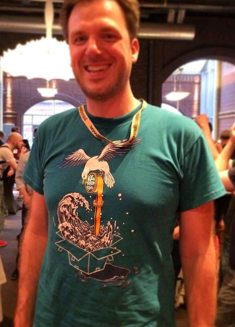 When Yuko said yes, it was nice to see how the design evolved. We decided to set the actual periscope logo as the base and she sent three rough sketches of ideas. We agreed on one, fine-tuned the idea and then she started sketching the actual design. Yuko then teased us with details of the final artwork (which I love, as I like to keep the design stuff secret until attendees actually arrive at the event, but teasing is lovely). When I got the final piece, I was super happy. I had to tease people a bit more when Holger and I proof printed the final color decision on my beyond tellerrand Instagram account. I myself am absolutely pleased with the outcome and I have seen, that many people already have worn the t-shirt on the second day of the event – so it seems they liked it as well.