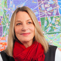 I make discoveries with them, nonetheless. I learn a lot. I learn a lot about places. There are things that I add to it. This is from my most recent show, which was all about the United States. I found that it’s the opposite of graphic design so that when I’m doing one thing that takes about five seconds because I’m working on four things at once. I’m telling different people what to do, and we’re moving things. Then I’m running into a meeting and out of a meeting, and then I’m going into another room and doing something else. The idea of being in a room with a little teeny brush on a great big canvas and painting something this monotonous is actually terrific for my work because they’re opposites, and they balance what I do at day and in private life. I love doing it.